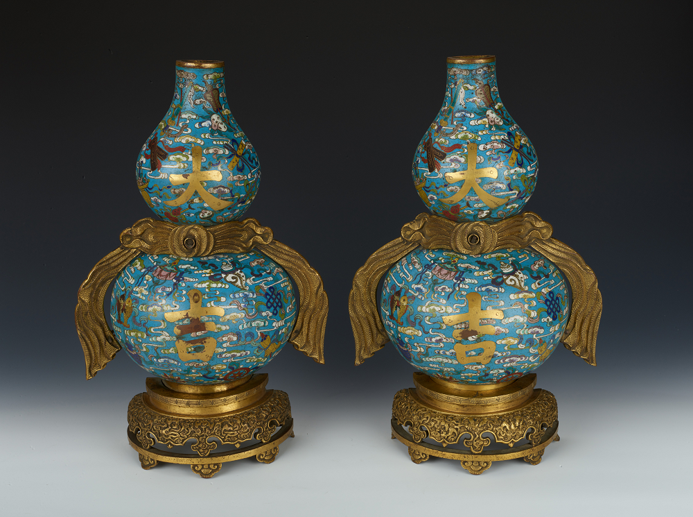 “大吉”掐絲琺瑯葫蘆瓶,明代。此對(duì)壁瓶銅胎鍍金,材質(zhì)、做工及紋飾均相同,可合二為一體。束腰飾鍍金飄帶,鏤空“福壽如意”紋銅座,如意云頭形足;以淺藍(lán)色琺瑯釉為地,上部飾暗八仙紋,下部飾八吉祥紋,間飾朵云紋,上、下腹中心鎏金楷書(shū)“大”“吉”二字。